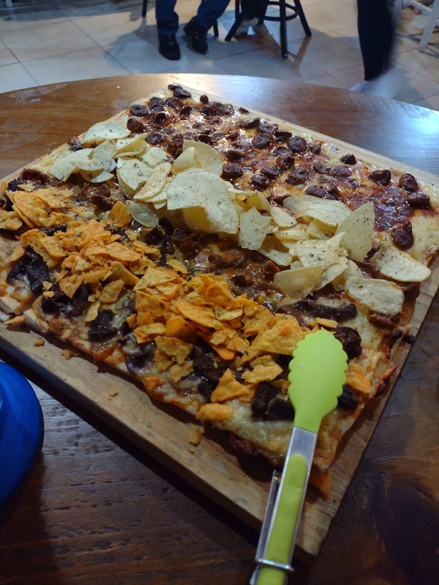 Lugar legal, com música boa e pizza muito saborosa. Pena que logo na primeira vez já nos colocaram ao lado(quero dizer menos de 1 metro) do palco e com uma tv acima da cabeça. Ficou complicado conversar com tanto barulho. Só na base do grito. Atendimento foi demorado e meio confuso no início, mas depois conseguimos um garçom gente boa, ágil e prestativo. Ligaram um ventilador bem encima da gente (o único ligado em todo o ambiente) e a pizza esfriou rápido, ficando muito difícil de comer. A pizza que pegamos foi 30x30 e é bem grande, dá tranquilamente para duas pessoas e até sobra.